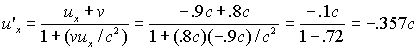 Let’s take the point of view of the crew on the Chinese spaceship. The only number we have in common is that we both hold that the other ship went by at .8c. You tell them you started in pursuit 1 year after the passing. They conclude you started when their clocks read 1.667 years because your clock was running only 60% as fast as theirs. By their reckoning, you were 1.333 light years away when you started in pursuit (x = vt; .8c times 1.667). And they observed your pursuit speed at -.357c (Relativistic Velocity Addition of the American spaceship, .8c, plus the shuttlecraft, -.9c). Again, by their reckoning, it took you 3.734 years to cover the 1.333 light years separation (t = x/v). So, on their clocks, 1.667 years waiting + 3.734 years pursuing gives 5.401 years expired off their clocks when you meet. That’s the same prediction I made for their clocks give or take.